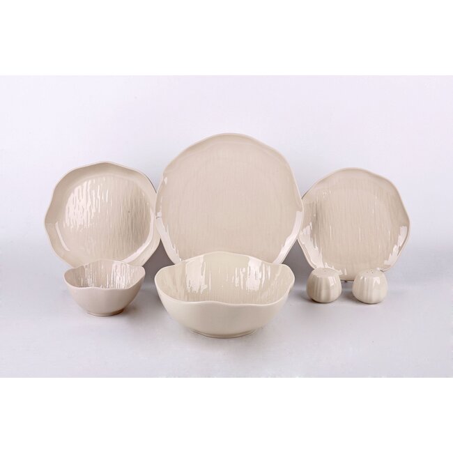 Create an atmospheric table setting with the Cermico 27-piece dinnerware set. The Cermico dinnerware set is suitable for 6 people and consists of 6 soup bowls, 6 dinner plates, 6 deep plates, 6 dessert plates, 2 salt and pepper sets, and a salad bowl.